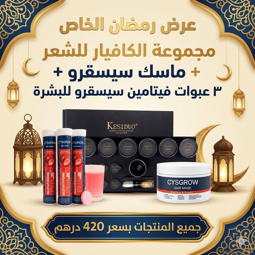 استقبلي العيد بإشراقة لا مثيل لها مع مجموعة العناية الشاملة التي تجمع بين التغذية الداخلية والترميم الخارجي. عرض حصري يجمع أقوى منتجات سيسقرو (CYSGROW) ومجموعة الكافيار الفاخرة.