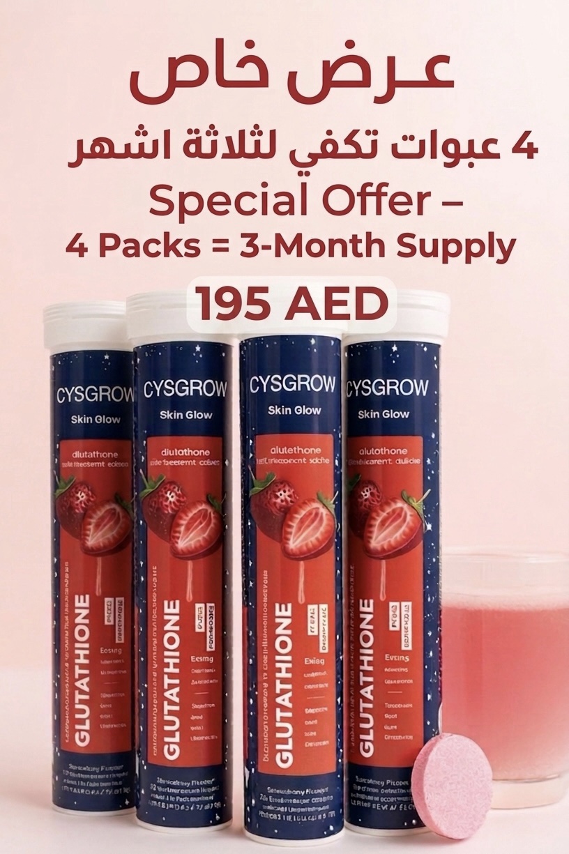 امنحي بشرتك الدعم الذي تستحقه مع أقراص Cysgrow Skin Glow الفوارة، المدعّمة بتركيبة فعالة من الجلوتاثيون، حمض الهيالورونيك، ومزيج من الفيتامينات ومضادات الأكسدة.